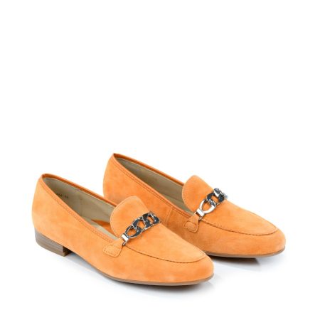 Ženske ravne cipele mokasine. Lice cipele od brušene kože dunja žute boje, sa ukrasnom šnalom duž širine cipele. Kožno gazište. Đon od prilagođene visine kvalitetne gume.